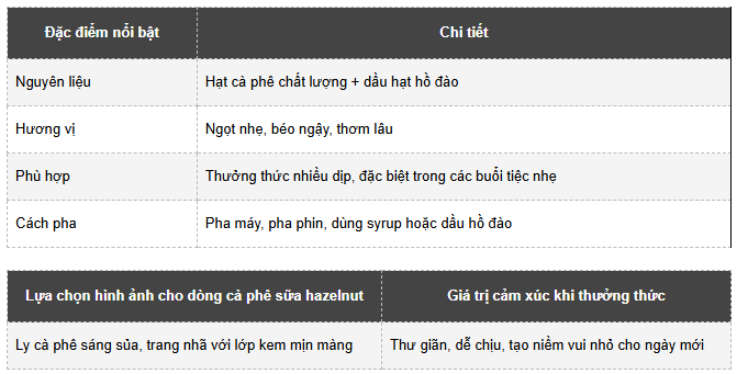 CÀ PHÊ SỮA HAZELNUT của TILI được pha chế từ những hạt cà phê đặc biệt, kết hợp với dầu hạt hồ đào thiên nhiên, tạo ra một thức uống có hương thơm đặc trưng, lôi cuốn. Dầu hồ đào không chỉ bổ sung hương vị béo ngậy mà còn giúp khoáng đạt cho các giác quan, kích thích sự thèm muốn.